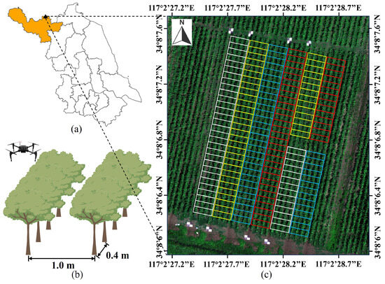 The field experiment was conducted at the Ginkgo biloba planting base of Xuzhou Changrong Agricultural Development Co. in Pizhou, Xuzhou City, Jiangsu Province, China (34°8′42″ N, 117°2′45″ E), as shown in Figure 1. The investigation was carried out on three-year-old Ginkgo biloba trees planted in February 2020. The trees were planted with a row spacing of 1 m and a column spacing of 0.4 m (Figure 1). The experiment consisted of 176 plots, each measuring 0.8 × 4 m2, with eight trees in each plot. Four levels of nitrogen (N) fertilizers (N0–N3: 0, 100, 200 and 300 kg/ha) were applied to the plots. N fertilization was applied in mid-April, early-May and late-May at rates of 40%, 30% and 30%, respectively. Additionally, the same amount of phosphate (P, 120 kg/ha) and potash (K, 200 kg/ha) were treated in all plots. Field images were acquired between 10:00 and 14:00 local time on 2 August 2023. Field assessments, destructive sampling and UAV flight missions were conducted in clear weather circumstances. Weed and insect pests in the field were controlled manually, and no agricultural chemicals were used.