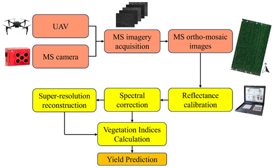 The image processing starts with pre-processing MS camera images in Pix4Dmapper 4.5.6 (Pix4D, Lausanne, Switzerland) to generate ortho-mosaic images and perform radiometric calibration, as shown in Figure 2. The process involves geolocating photos, importing ground control points (GCPs), aligning images, creating dense point clouds and ortho-mosaic images, and calibrating radiometric images. The center points of black and white checkered boards from Figure 1c were used as GCPs, which provide high contrast for precise image alignment. These GCPs are captured with high-precision GPS equipment, ensuring an accuracy of ±2 cm in both horizontal and vertical dimensions. The image alignment is performed using the registration tool in the ENVI 5.6 software. Dense point clouds are created by the structure-from-motion (SfM) technique to enhance the photogrammetric process in Pix4Dmapper. Radiometric calibration is used on the MS images to improve the radiometric accuracy of the data and convert the digital number (DN) values to reflectance by comparing them to images with established reflectance values for calibration. Spectral correction further refines this process by adjusting the wavelength calibration and ensuring accurate spectral response. Furthermore, three widely used vegetation indices (VIs) closely associated with crop features were employed in this study for predicting crop production (Table 3).