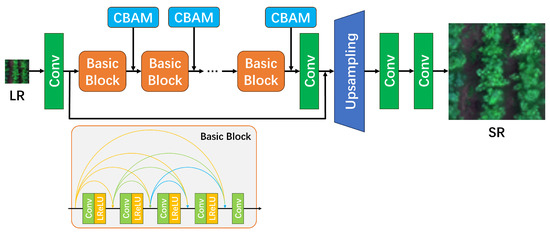 Generator network structure of RMSRGAN. Conv, LReLU and CBAM represent the convolution layer, leaky rectified linear unit and convolutional block attention module, respectively. The size of the convolutional layer is 3 × 3, the stride is 1, and the number of filters is 64.