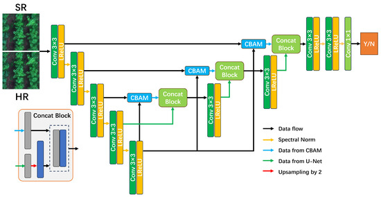 Discriminator network structure of RMSRGAN. Concat Block, Conv and LReLU represent the concatenate block, convolutional layer and leaky rectified linear unit, respectively. The size of the convolutional layer is 3 × 3, the stride is 1, and the number of filters is 64.