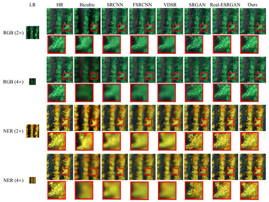 We conducted a qualitative assessment of the reconstructed images in addition to the quantitative evaluation, as depicted in Figure 7. The first column displays the LR image, the second column shows the HR image, and the subsequent columns exhibit the LR image rebuilt by each of the seven models. We have captured the same locations in these photos for zooming-in to aid in evaluating image details. These sites are marked by red boxes in Figure 7. The three CNN-based reconstruction models can recover more image details than the bicubic interpolation method on RGB images, but the contours are blurred; however, they cannot produce better results than the bicubic interpolation method regarding the reconstruction effect on NER images. The three GAN-based reconstruction models may significantly enhance the visual texture and features of the image during reconstruction. Real-ESRGAN and RMSRGAN (ours) can better recreate the texture aspects of images and produce more impressive visual effects than SRGAN. However, a small amount of unwanted artifacts appear in the reconstruction results of the former two models, especially in the brighter regions of the NER image.