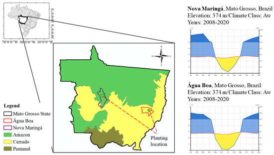 Água Boa is located in the Brazilian cerrado region. Its soils are classified as cambisols and oxisols [34]. The area has an average altitude of 357 m above sea level and an Aw climate (tropical climate, with dry winters) according to the Köppen–Geiger classification. The average annual rainfall is 1801 mm, concentrated from September to April, with a dry period of four months (May to August) [33]. The mean annual temperature is 26.8 °C [33].