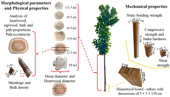 To determine the correlations between air-dry density, mean diameter (2.3 m), and physical and mechanical properties, Pearson’s correlation coefficient was used (p ≤ 0.05).