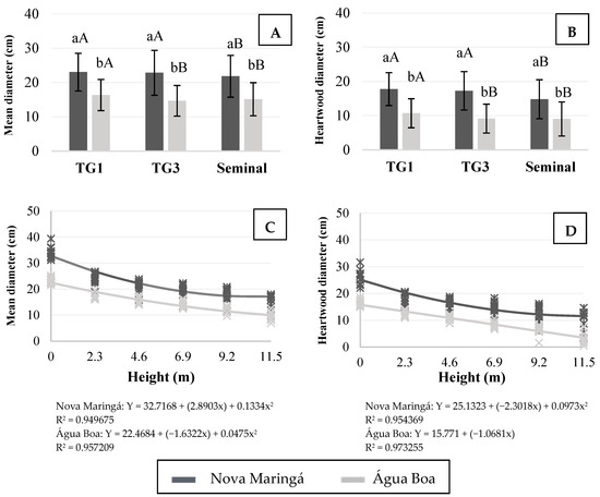 The heartwood diameter tended to decrease along the stem (Figure 3D), corroborating the findings of Fernández-Sólis et al. [45]. Comparing the planting sites, the heartwood diameter of trees from Nova Maringá was greater at all heights evaluated, ranging from 25 cm (base) to 11 cm (11.5 m), while for trees from Água Boa, the diameter of the heartwood length ranged from 20 cm (base) to 3.48 cm (11.5 m).