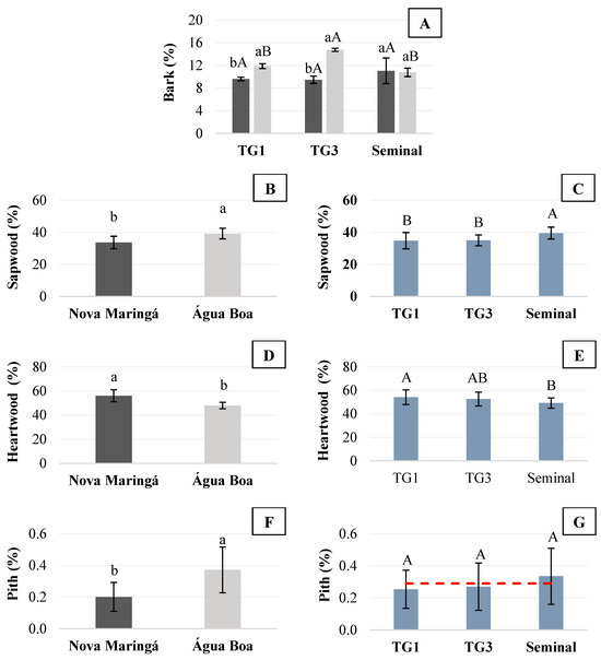 Percentages of bark (A), sapwood (B,C), heartwood (D,E), pith (F,G) and pith eccentricity (H,I) at a height of 2.3 m for different genetic materials of Tectona grandis trees planted in Nova Maringá and Água Boa, Mato Grosso, Brazil. Means followed by the same letter were not significantly different according to Tukey’s test (p < 0.05). For the bark (%), lowercase letters represent a significant difference at the site within the genetic material, and capital letters represent a significant difference in the genetic material within the site. The bars correspond to the standard deviation. Red dashed lines indicate the mean values.