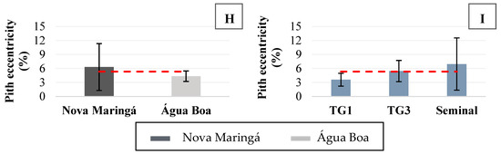 There was no significant difference (p < 0.05) in pith eccentricity, either for the planting site (Figure 4H) or for the genetic material factor (Figure 4I), resulting in an average value equal to 5.33%. This parameter is used to evaluate the resulting effect of growth stresses due to terrain slope, winds, and genetic factors [57].