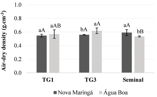 Wood air-dry density at hygroscopic equilibrium moisture content (~12%) of different genetic materials of Tectona grandis at 13 years of age planted in Nova Maringá and Água Boa, Mato Grosso, Brazil. Means followed by the same letter were not significantly different according to Tukey’s test (p < 0.05). Lowercase letters represent significant differences at the site within the genetic material, and capital letters represent significant differences in the genetic material within the site. The bars correspond to the standard deviation.