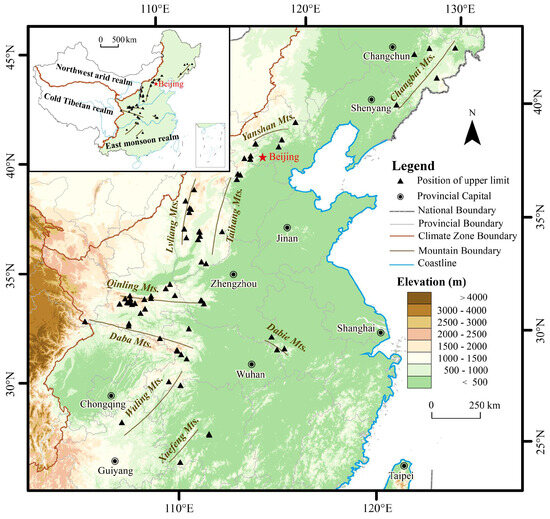 - Wang, Z.Y.; Han, F.; Li, C.R.; Mu, H.X.; Wang, Z. Dataset of the upper limit of montane deciduous broad-leaved forests in the east monsoon realm of China. Digit. J. Glob. Change Data Repos. 2023. [CrossRef]