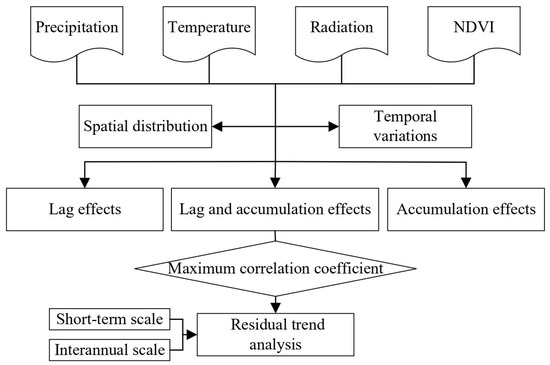This study initially examined the spatial distribution and temporal trends of climate factors and NDVI, as illustrated in Figure 2. Subsequently, it investigated the time-lag, accumulation, and combined effects of these climatic factors on NDVI. Utilizing the periods of maximum correlation between climatic factors and NDVI, the study quantified their relative contributions to both short-term and interannual NDVI variations.
