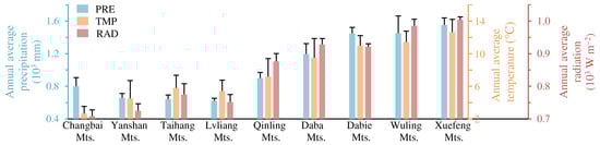 The annual average temperature at the upper limit of MDBF in the nine mountainous areas ranged from 2.63 to 12.62 °C, and the annual average radiation varied from 705.91 to 1003.67 W m−2. The standard deviation of the annual average radiation varied from 9.13 to 33.52 W m−2, with the larger latitudinal span of the Taihang Mts. resulting in the least concentrated distribution of the annual average radiation (33.52 W m−2) (Figure 1).