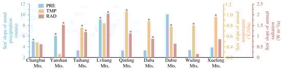 Sen’s slope of the annual precipitation, temperature, and radiation at the upper limit of montane deciduous broad-leaved forests in nine mountainous areas. * represent a significance level of 0.05.