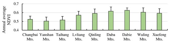 From 2001 to 2018, the annual average NDVI at the upper limit of DBLF in the nine mountainous areas ranged from 0.503 to 0.626 (Figure 5). As precipitation and temperature increase, the annual average NDVI exhibits an increasing trend, with the Dabie and Yanshan Mts. recording the maximum and minimum values, respectively. The standard deviation of the annual average NDVI ranged from 0.027 to 0.051. The distribution of the annual average NDVI in the Xuefeng Mts. is the least concentrated, whereas the Dabie Mts. displayed the opposite pattern.