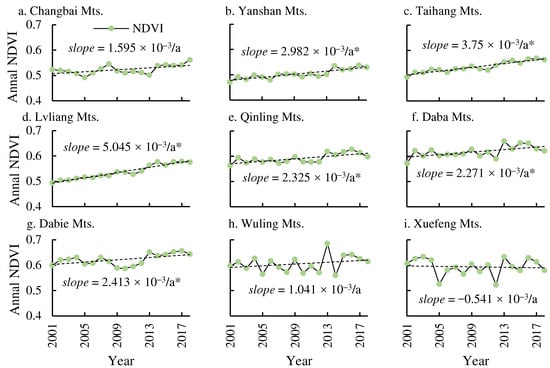 Sen’s slope of the annual NDVI at the upper limit of montane deciduous broad-leaved forests in nine mountainous areas. * represent a significance level of 0.05.