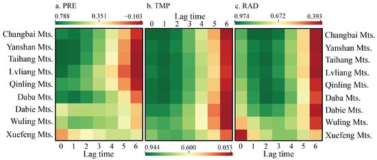 Correlation between precipitation (a), temperature (b), and radiation (c) with different lag times and the NDVI at the upper limit of montane deciduous broad-leaved forests in nine mountainous areas.