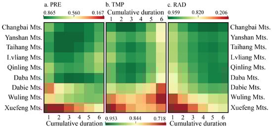 Correlation between precipitation (a), temperature (b), and radiation (c) with different cumulative durations and the NDVI at the upper limit of montane deciduous broad-leaved forests in nine mountainous areas.