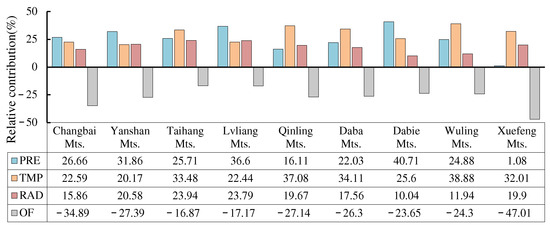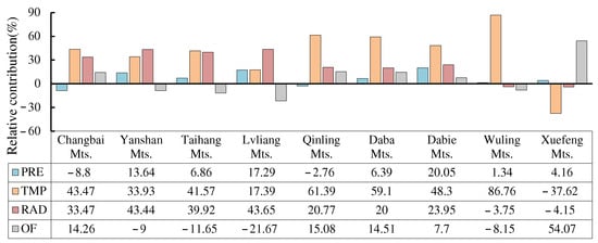 TMP and RAD are the main climate factors for the annual NDVI variation at the upper limit of MDBF in nine mountainous areas, with relative contributions ranging from −37.62% to 86.76% and −4.15% to 43.65%, respectively (Figure 10). TMP only has a significant negative contribution to the annual NDVI variation of the Xuefeng Mts., with a relative contribution of −37.62%. RAD from the Xuefeng and Wuling Mts. has a negative contribution to annul NDVI variation (−3.75% and −4.15%). PRE has the greatest negative contribution to the Changbai Mts. (−8.8%), while OF has the greatest negative contribution to the Lvliang Mts.