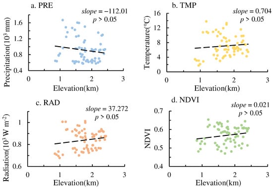 The spatial distribution of climatic factors and NDVI at the upper limit of MDBF was explored using the mean values and standard deviation [51]. Mean values represent the overall distribution of PRE, TMP, RAD, and NDVI at the upper limit of MDBF, whereas standard deviation indicates the dispersion among these variables at the sample points.