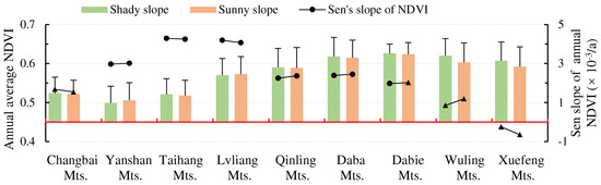 From 2001 to 2018, the Sen’s slope of the annual NDVI at the upper limit of MDBF in the nine mountainous areas ranged from −0.541 to 5.045 × 10−3/a (Figure 6). Only the Xuefeng Mts. showed a decreasing trend in the annual NDVI, whereas the other mountainous areas exhibited an increasing trend, with Lvliang Mts. recording the highest slope of increase (5.045 × 10−3/a). The Sen’s slope of the annual NDVI demonstrated a clear north–south variation, with a trend of increasing followed by decreasing from the Changbai Mts. to the Xuefeng Mts. The mountainous areas north of the Daba Mts. showed a significant increase in the annual NDVI (2.271 to 5.045 × 10−3/a), whereas the trend in the southern mountainous areas (−0.541 to 2.413 × 10−3/a) was not significant.