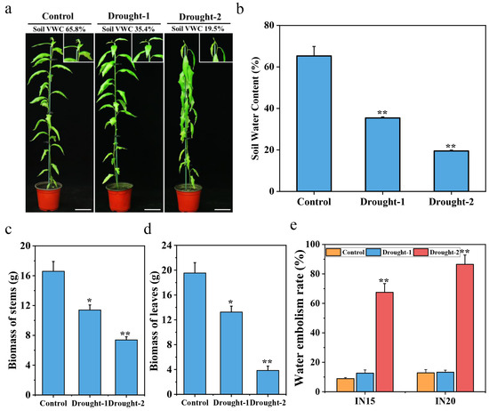 Morphological and anatomical analyses of plants under control and drought conditions. (a) Images of whole P. trichocarpa plants taken under control, Drought-1, and Drought-2 conditions. The scale bar is equal to 8.5 cm. (b) Quantification of soil VWC under control, Drought-1, and Drought-2 conditions. (c) Quantification of stem biomass and (d) leaf biomass under control and drought conditions. (e) Quantification of the water embolism rate between the 15th and 20th internodes under control and drought conditions. Error bars indicate the mean ± SE (n = 3) from three independent experiments. A two-tailed Student’s t-test was used to determine statistical significance. * p < 0.05 and ** p < 0.01.
