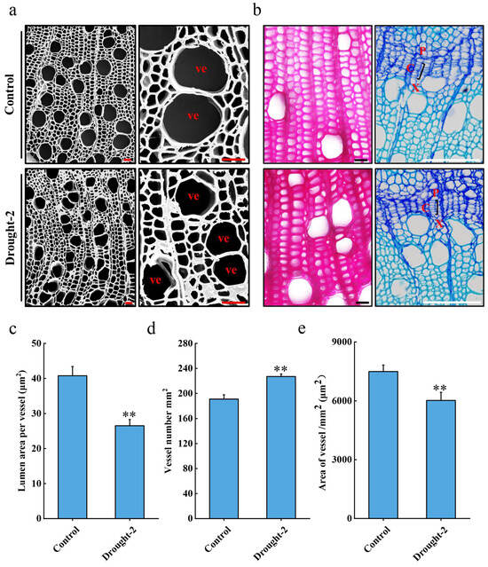 Analyses of xylem and cambium morphologies and lignin deposition under drought stress. (a) Stem cross-sections taken from the 15th internode of plants under control and Drought-2 conditions were observed with a scanning electron microscope (SEM). Red scale bars are equal to 100 μm, vessel cell (ve). (b) Lignin-specific histochemical and toluidine blue staining of stem cross-sections taken from the 15th internode of plants under control and Drought-2 conditions. The black scale bars are equal to 20 μm, and the white scale bars are equal to 100 μm, xylem zone (X), cambium zone (C), and phloem zone (P). (c) Quantification of lumen area per vessel, (d) vessel number, and (e) area of the vessel. Error bars indicate the mean ± SE (n = 3) from six sections per three independent experiments. A two-tailed Student’s t-test was used to assess statistical significance; ** p < 0.01.