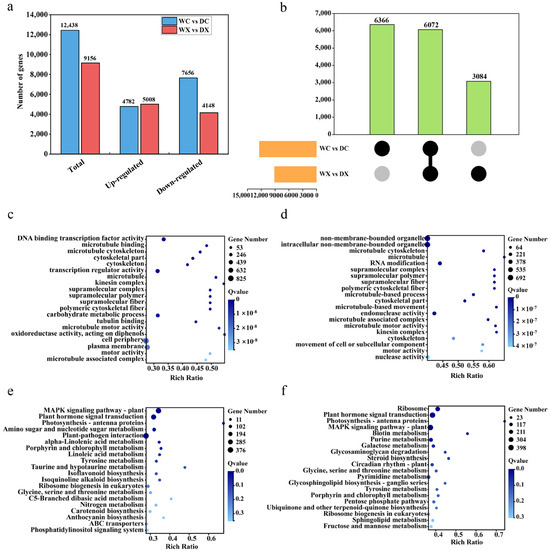 Identification and functional enrichment of DEGs (differentially expressed genes) in WX (xylem under control) versus DX (xylem under drought) and WC (cambium under control) versus DC (cambium under drought). (a) Statistical analyses of upregulated and downregulated DEGs under different treatment conditions. (b) UpSet diagram of DEGs under different treatment conditions. (c) GO enrichment analysis for DEGs between WX and DX. (d) GO enrichment analysis for DEGs between WC and DC. (e) KEGG enrichment analysis for DEGs between WX and DX. (f) KEGG enrichment analysis for DEGs between WC and DC. The color scale represents log2 fold-change values with light blue to dark blue, indicating expression values from low to high, respectively. The area of the circle represents the number of genes annotated with the given term.