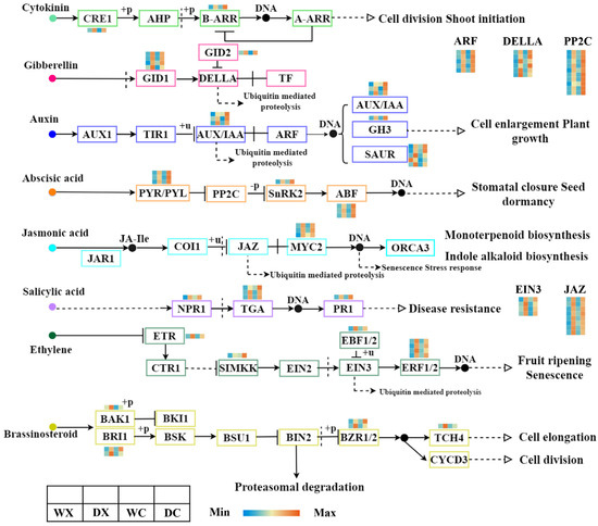 Analyses of DEGs related to the plant hormone signal transduction pathway. Abbreviations: xylem under control (WX); xylem under drought (DX); cambium under control (WC); cambium under drought (DC); cytokinin receptor (CRE1); histidine-containing phosphotransfer protein (AHP); two-component response regulator ARR-B family (B-ARR); two-component response regulator ARR-A family (A-ARR); gibberellin receptor (GID1); F-box protein (GID2); DELLA protein (DELLA); auxin influx carrier (AUX1); transport inhibitor response 1 (TIR1); auxin-responsive protein IAA (AUX/IAA); auxin response factor (ARF); auxin-responsive GH3 gene family (GH3); SAUR family protein (SAUR); abscisic acid receptor PYR/PYL family (PYR/PYL); protein phosphatase 2C (PP2C); serine/threonine-protein kinase SRK2 (SnRK2); ABA-responsive element-binding factor (ABF); jasmonic acid-amino synthetase (JAR1); coronatine-insensitive protein 1 (COI1); jasmonate ZIM domain-containing protein (JAZ); transcription factor MYC2 (MYC2);regulatory protein NPR1 (NPR1); transcription factor TGA (TGA); pathogenesis-related protein 1 (PR1); ethylene receptor (ETR); mitogen-activated protein kinase kinase 4/5 (SIMKK); EIN3-binding F-box protein (EBF1/2); ethylene-insensitive protein 3 (EIN3); ethylene-responsive transcription factor 1 (ERF1); brassinosteroid insensitive 1-associated receptor kinase 1 (BAK1); protein brassinosteroid insensitive 1 (BRI1); BR-signaling kinase (BSK); brassinosteroid resistant 1/2 (BZR1/2); xyloglucan: xyloglucosyl transferase TCH4 (TCH4); cyclin D3 (CYCD3). The color scale represents the log2 fold-change in gene expression, with the lowest expression represented by blue to the highest expression in red.