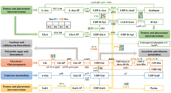 Analyses of DEGs related to the amino sugar and nucleotide sugar metabolism pathways. Abbreviations: xylem under control (WX); xylem under drought (DX); cambium under control (WC); cambium under drought (DC); L-Arabinose (L-Ara); beta-L-Arabinose 1-phosphate (L-Ara-1P); UDP-L-arabinose (UDP-L-Ara); UDP-L-arabinofuranose (UDP-L-Araf); UDP-D-xylose (UDP-D-Xyl); 1,4-beta-D-Xylan (1,4-β-D-Xylan); D-Xylose (D-Xyl); D-Glucuronate (GlcA); D-Glucuronate 1-phosphate (GlcA-1P); UDP-glucuronate (UDP-GlcA); UDP-apiose (UDP-D-Api); alpha-D-Glucose (Glc); D-Glucose 1-phosphate (Glc-1P); alpha-D-Glucose 6-phosphate (Glc-6P); UDP-glucose (UDP-Glc); UDP-4-dehydro-6-deoxy-D-glucose (UDP-4-keto-6-deoxy-D-Glc); UDP-4-keto-rhamnose (UDP-4-keto-Rha); UDP-L-rhamnose (UDP-Rha); UDP-6-sulfoquinovose (UDP-SQ); UDP-alpha-D-galactofuranose (UDP-Galf); alpha-D-Galactose (α-Gal); alpha-D-Galactose 1-phosphate (Gal-1P); UDP-alpha-D-galactose (UDP-Gal); D-Galacturonate (GalA); 1-Phospho-alpha-D-galacturonate (GalA-1P); UDP-D-galacturonate (UDP-GalA); L-arabinokinase (E2.7.1.46); 1,4-beta-D-xylan synthase (E2.4.2.24); hexokinase (HK); alpha-L-arabinofuranosidase (abfA); UDP-glucose 4-epimerase (galE); phosphoglucomutase (pgm); UDP-glucuronate decarboxylase (UXS1); UDP-glucuronate 4-epimerase (GAE); UDP-sugar pyrophosphorylase (USP); UDP-arabinose 4-epimerase (UXE); UDP-apiose/xylose synthase (AXS); UDP-glucose 4,6-dehydratase (RHM); 3,5-epimerase/4-reductase (UER1); UDP-arabinopyranose mutase (RGP); xylan 1,4-beta-xylosidase (XYL4); glucuronokinase (GLCAK); UTP-glucose-1-phosphate uridylyltransferase (UGP2); alpha-1,4-galacturonosyltransferase (GAUT); UDPglucose 6-dehydrogenase (UGDH); galacturonokinase (GALAK). The color scale represents the log2 fold-change in gene expression, with the lowest expression represented by blue to the highest expression in red.