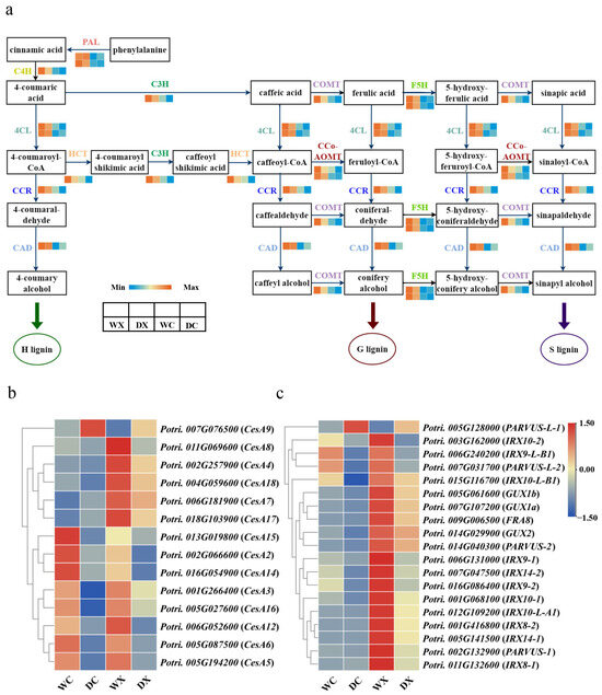 Analyses of DEGs related to the monolignol, cellulose, and hemicellulose biosynthesis pathways. (a) DEGs related to the monolignol biosynthesis pathway. (b) Heatmaps of DEGs related to cellulose, and (c) hemicellulose biosynthesis. Abbreviations: xylem under control (WX); xylem under drought (DX); cambium under control (WC); cambium under drought (DC); phenylalanine ammonia-lyase (PAL); 4-coumarate-CoA ligase (4CL); ferulate-5-hydroxylase (F5H); cinnamoyl-CoA reductase (CCR); shikimate O-hydroxycinnamoyltransferase (HCT); caffeic acid 3-O-methyltransferase/acetylserotonin O-methyltransferase (COMT); cinnamyl-alcohol dehydrogenase (CAD); caffeoyl-CoA O-methyltransferase (CCoAOMT); trans-cinnamate 4-monooxygenase (C4H); 5-O-(4-coumaroyl)-D-quinate 3′-monooxygenase (C3H). The color scale represents the log2 fold-change in gene expression, with the lowest expression represented by blue to the highest expression in red.