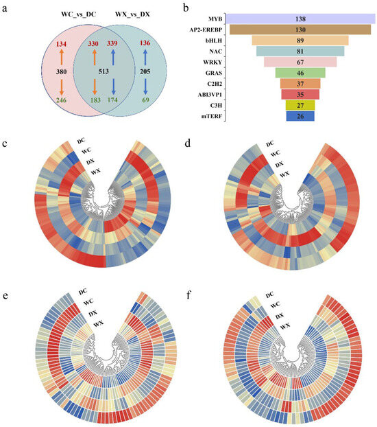 A comparison of differentially expressed transcription factors (TFs) between and within treatment groups. (a) A Venn diagram of differentially expressed TFs unique to and shared between the WC versus DC and WX versus DX treatment groups. Pink circle: WC versus DC; blue circle: WX versus DX. The black number indicates the number of DEGs, the red number indicates the number of upregulated DEGs, and the green number indicates the number of downregulated DEGs annotated as TFs. (b) The number of differentially expressed TFs within each of the top ten most abundant TF families. (c) Heatmap showing the expression of TFs in the MYB family, (d) AP2-EREBP family, (e) bHLH family, and (f) NAC family. Abbreviations: xylem under control (WX); xylem under drought (DX); cambium under control (WC); cambium under drought (DC). The color scale represents the log2 fold-change with blue to red, indicating expression values from low to high.