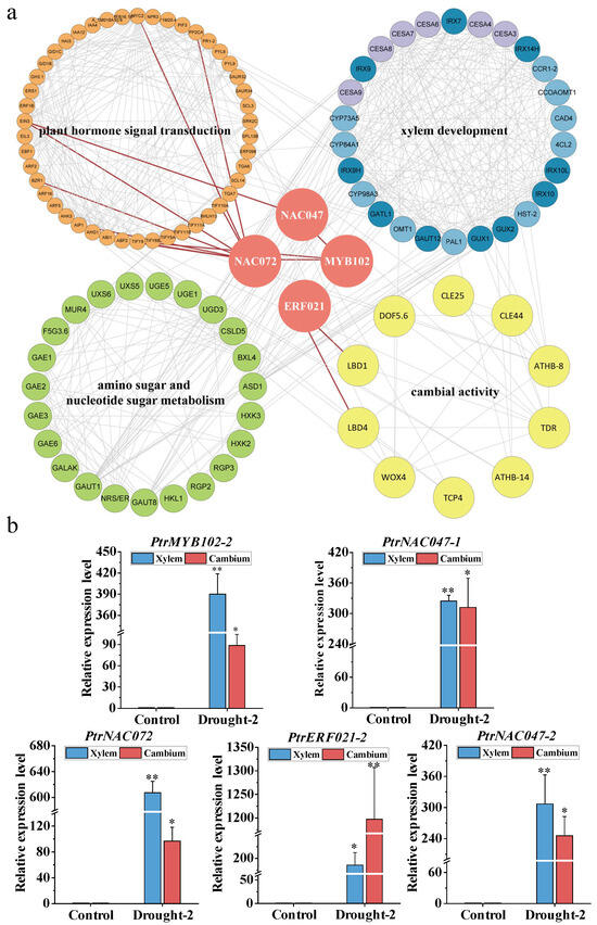 To better understand the mechanism of wood formation during drought stress, we focused on the eight TFs identified in the previous paragraph. We constructed an interaction network of proteins with functions related to plant hormone signal transduction and amino sugar and nucleotide sugar metabolism (Figure 8a). The proteins’ physical interactions between NAC047, NAC072, and MYB102 were closely related to plant hormone signal transduction. MYB102 directly interacted with ABF2, NAC072 directly interacted with BZR1 and MYC2, and NAC047 and NAC072 directly interacted with EIN3. Interestingly, MYC2 and EIN3 directly interacted with PAL1, which is involved in monolignol biosynthesis. Monolignol, cellulose, and hemicellulose biosynthesis-related proteins are closely related to sugar metabolism pathway proteins. Meanwhile, ERF021 directly interacted with LBD1 and LBD4, which are proteins involved in the regulation of cambium activity, and the cambium activity-related proteins are closely related to the proteins involved in plant hormone signal transduction. To support these results, we verified the expression of the TFs in the xylem and cambium under drought stress using RT-qPCR (Figure 8b). The results showed that PtrERF021-2 was significantly upregulated in the cambium under drought, and PtrMYB102-2, PtrNAC047-1, PtrNAC047-2, and PtrNAC072 were significantly upregulated in the xylem under drought. Therefore, we concluded that PtrERF021-2, PtrMYB102-2, PtrNAC047-1, PtrNAC047-2, and PtrNAC072 played important roles in wood formation by regulating the hormone signal transduction and amino sugar and nucleotide sugar metabolisms under drought stress.