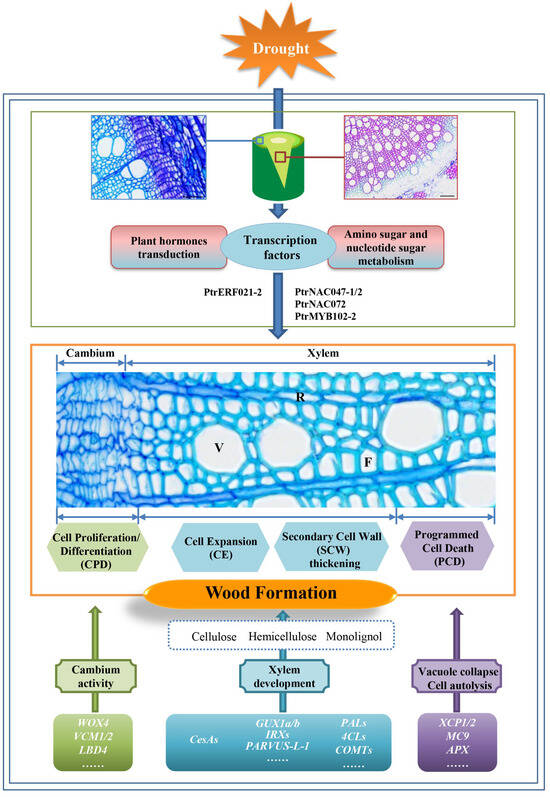 Schematic summary of changes in gene expression during wood formation under drought stress. V: vessel cells; F: fiber cells; R: ray cells.