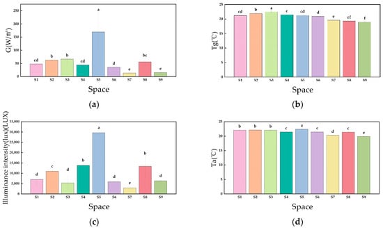 A one-way ANOVA analyses of variance were performed on the meteorological parameters for each space, as shown in Appendix C. The results indicated significant differences (p < 0.01) in air temperature, relative humidity, wind speed, global radiation, globe temperature, and illuminance intensity for the nine spaces, suggesting significant differences in the micrometeorological conditions between the spaces. The significance of the differences between two by two for each space was determined by Tukey’s post hoc test and is shown in Figure 3.
