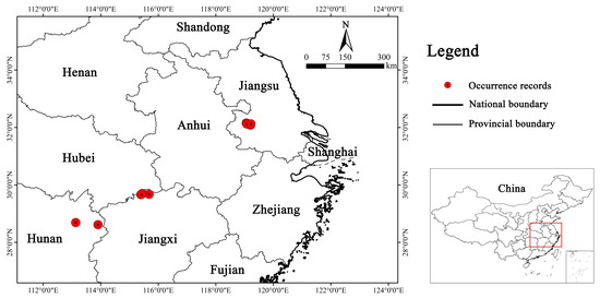 The data regarding the wild distribution of Y. zenii were primarily obtained through the following approaches: (1) Investigating in field: in the past three years (2021–2023), we carried out comprehensive surveys for Y. zenii wild populations in Anhui, Jiangsu, Jiangxi, Zhejiang, and other provinces of eastern China to acquire their spatial localities. (2) Searching through resource sharing platforms: these include the Global Biodiversity Information Facility (GBIF, https://www.gbif.org/, last accessed on 5 January 2024), the National Specimen Information Infrastructure (NSII, http://nsii.org.cn/, last accessed on 5 January 2024), the Chinese Virtual Herbarium (CVH, https://www.cvh.ac.cn/, last accessed on 5 January 2024), and the Plant Photo Bank of China (PPBC, http://ppbc.iplant.cn/, last accessed on 5 January 2024). (3) Consulting the published literature and relevant reports [27]: we used the key words of Y. zenii’s specific name, Latin name, and its synonym (i.e., Magnolia zenii) in Flora of China, provincial floras, and related checklists to gather its distribution points. In this way, we initially collected 32 natural distribution records of Y. zenii.