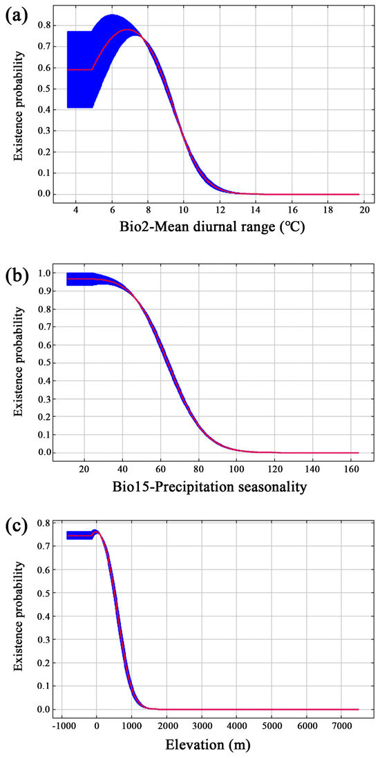 When the existence probability was greater than 0.51, it corresponded to a moderately or highly suitable area, which was conducive to the growth of Y. zenii. We opted to utilize the response curve generated by MaxEnt to reveal the relationships between environmental factors and the existence probability in the current period (Figure 3). The existence probability of this species showed a trend of first increasing and then decreasing with the change in the mean diurnal range (Bio2) and reached a maximum at 6.88 °C. As shown in Figure 3a, it was optimal for the survival of Y. zenii when the range was 4.87–9.06 °C. Its existence probability gradually decreased with an increasing precipitation seasonality of variation coefficient (Bio15), and its adaptation range was 20–64 (Figure 3b). The suitable values for the elevation factor ranged from 0 to 500 m (Figure 3c). And the existence probability dropped sharply as the elevation rose.