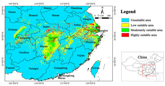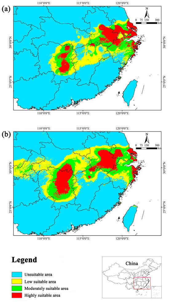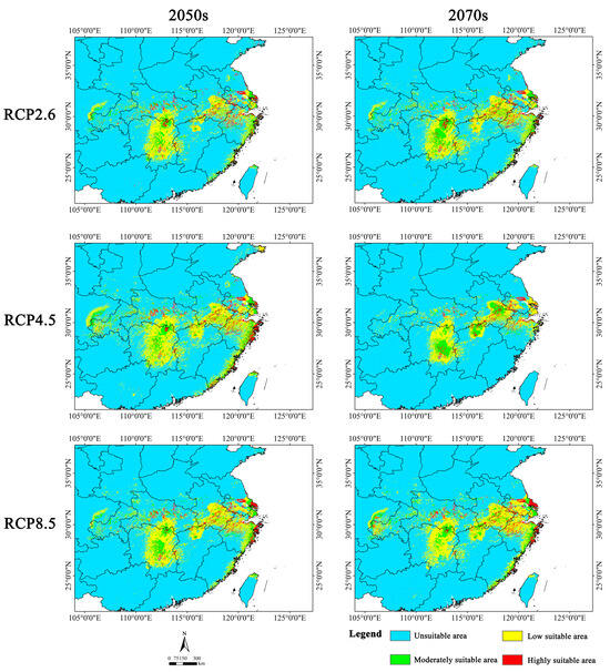 The suitable area distribution was primarily predicted to be concentrated in southern Jiangsu, southern Anhui, northern Zhejiang, eastern Hunan, central Hubei, and northern Jiangxi in the future, which largely aligns with the current suitable distribution. However, the suitable area is expected to be reduced in these provinces to varying degrees. In addition, we noticed that the highly suitable area is expected to expand in the coastal area of Zhejiang Province under three scenarios, namely 2050s RCP 4.5, 2050s RCP 8.5, and 2070s RCP 8.5 (Figure 6).