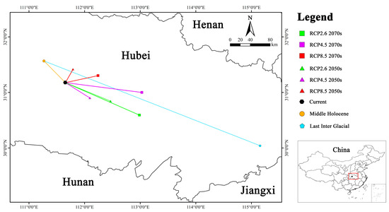The current centroid coordinates of Y. zenii (31.177° N, 111.656° E) are situated in Yuan’an County, Yichang City, Hubei Province. From the last interglacial period (30.041° N, 115.156° E) to the Middle Holocene (31.567° N, 111.271° E) and then to the current, the centroid migrated northwestward by 407.69 km at first and subsequently southeastward by 56.64 km. Under RCP 2.6, the centroid was predicted to migrate southeastward with a distance of 85.62 km in the 2050s (30.845° N, 112.467° E), while it is expected to shift 142.53 km to the southeast in the 2070s (30.592° N, 112.986° E). Under RCP 4.5, it is expected to migrate 51.97 km southeastward in the 2050s (30.900° N, 112.096° E) and 132.31 km to the southeast in the 2070s (31.001° N, 113.031° E). Under RCP 8.5, the centroid was predicted to move northeastward by a distance of 29.65 km in the 2050s (31.417° N, 111.792° E) and 57.51 km in the 2070s (31.303° N, 112.243° E).