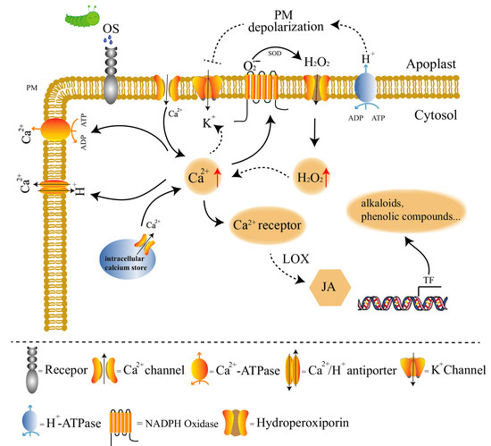 In summary, we have summarized the defense signaling pathway of Ammopiptanthus against insect herbivory. In brief, when Ammopiptanthus is subjected to insect feeding, the elicitors carried in the insect OS are recognized by the corresponding receptors on the damaged cell membrane, resulting in the transmembrane influx of extracellular Ca2+ through plasma membrane Ca2+ channels. Simultaneously, intracellular calcium stores release Ca2+ into the cytoplasm, causing a rapid increase in cytosolic Ca2+ ([Ca2+]cyt) concentration. The increase in [Ca2+]cyt might lead to the opening of inward-rectifier K+ channels on the plasma membrane, causing membrane depolarization, while the insect herbivory-induced efflux of H+ may balance the membrane depolarization caused by the influx of K+. The elevation in [Ca2+]cyt activates plasma membrane NADPH oxidase, which catalyzes the production of superoxide anions (O2·−), leading to the formation of H2O2 under the action of superoxide dismutase (SOD). H2O2 permeates the membrane and enters the cytoplasm, resulting in a burst of cytoplasmic reactive ROS. The accumulation of intracellular ROS may further promote the accumulation of [Ca2+]cyt. The increased Ca2+ binds to downstream calcium sensors, including calmodulin (CaM), calmodulin-like proteins (CMLs), calcineurin B-like proteins (CBLs), calcium-dependent protein kinases (CPKs), and calcium/calmodulin-dependent protein kinases (CDPKs) [54]. These calcium-binding proteins facilitate the phosphorylation or activation of associated proteins, thereby triggering the transcription of specific stress-responsive genes, leading to the biosynthesis of secondary metabolites such as alkaloids and phenolic compounds [55,56]. During this process, the excessive accumulation of [Ca2+]cyt is transported out of the cell via plasma membrane Ca2+-ATPase and Ca2+/H+ antiporters to prevent ion toxicity (in Figure 2).