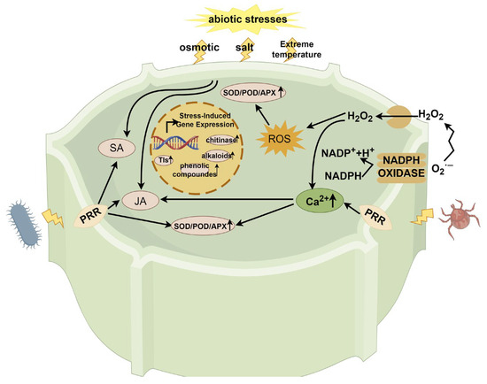 Indeed, the concept of cross-resistance or cross-tolerance highlights how plants can adapt more effectively to a variety of stresses, thereby promoting ecosystem stability. This further supports our perspective that since a plant’s own resources are limited, there are commonalities in the physiological responses and signaling components induced by various environmental factors (Table 2). These commonalities likely form the basis for the development of cross-resistance when plants respond to different stresses (in Figure 3).