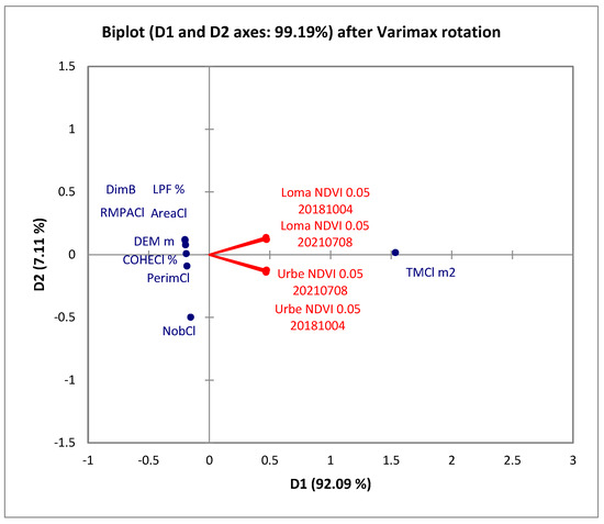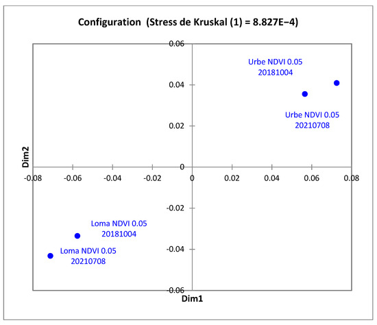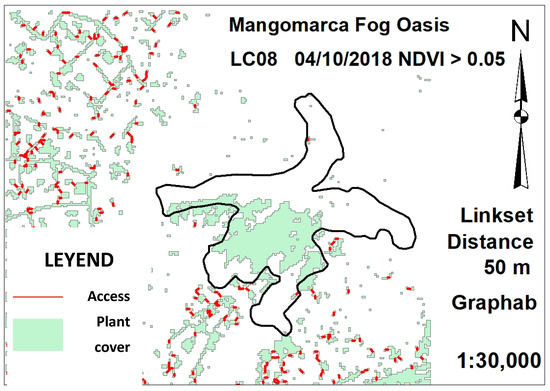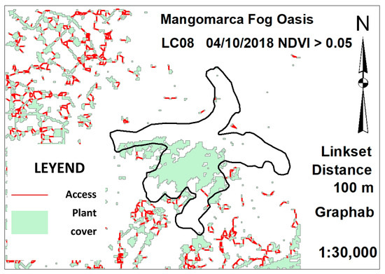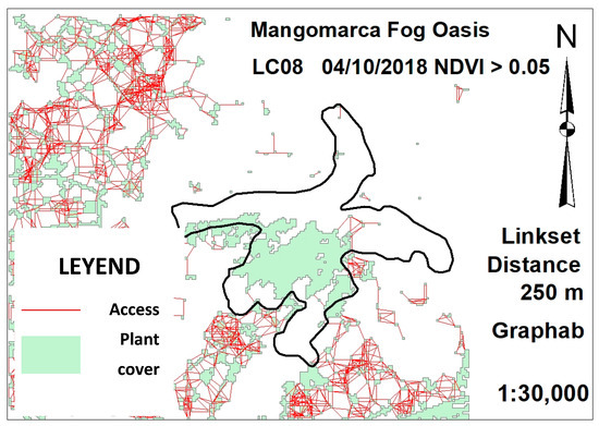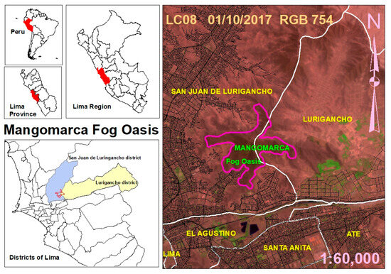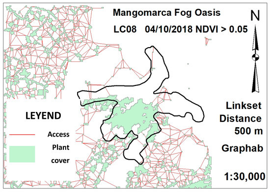 To facilitate the delimitation of green areas or vegetation cover of the city and the hills, satellite images were used, specifically the Normalized Difference Vegetation Index (NDVI), which is widely used in vegetation cover studies. The NDVI has been related to various parameters of vegetation dynamics, particularly with those photosynthetic capacity and primary productivity. This index provides a measure of plant greenness intensity and vigor. Sparse vegetation, such as shrubs and grasslands or senescent crops, presents moderate NDVI values (0.2–0.5), while high NDVI values (0.6–0.9) correspond to dense vegetation such as forests or crops in their maximum growth stage. In deserts, the NDVI values are low (0.06–1.2). In the present study, an NDVI threshold equal to or greater than 0.05 was used to delimit vegetation areas or patches of vegetation cover. Two dates of satellite images were used to take into account the seasonality and variability of hill vegetation; that is, the size and density of hill patches are never an absolute value, as they will increase or decrease according to months and years. While in August or September, peak greenness in hills is reached, not all years have the same values. Particularly in El Niño years, the hill greenness intensity values are much higher. The NDVI thresholds of 0.05 were established for two dates (8 July 2021 and 4 October 2021) and for two scenarios (urban area and hill). The dates only indicate the availability of cloud-free images for those moments; on the other hand, the binarization of the images at NDVI 0.05 was only a device to obtain a map of the green areas of the city and the hills (i.e., equal to or greater than NDVI 0.05 implies vegetation cover; less than NDVI 0.05 equates to areas without vegetation).