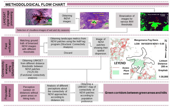 A paradigmatic case for research is constituted by the Mangomarca hills and the contiguous area in the district of San Juan de Lurigancho due to the presence of a hill, an archaeological area, and the urban area itself. In this context, the present research aimed to measure the degree of connectivity of the green areas (parks and gardens) of the city and the patches of vegetation in the hills in a sector of the district of San Juan de Lurigancho. Connectivity was conceptualized as links, connections, or corridors between parks, gardens, and patches of hill vegetation. Such green corridors would provide routes for walkers who wish to reach the hills via paths with plant presence or vegetation cover. In this case, the vegetation would offer the following ecosystem services: (a) microclimate moderation (increased coolness) and (b) a semi-natural landscape. A scenario was posed of a walk on a sunny summer’s day, with varying degrees of need for protection (sunscreen or hat). In this case, green corridors would only have this condition according to the different preferences of walkers regarding the maximum distances between patches of vegetation cover they could walk without solar protection (sunscreen or hat). A survey was conducted to discover the degree of tolerance for such distances (10, 25, 50, 100, 250, and 500 m or more). The survey also inquired about the maximum distance they could tolerate without enjoying a semi-natural landscape. In summary, the connectivity thresholds employed (distances) were not explained by the requirements of some biological species or fauna, nor by any ecological justification. In this case, connectivity was posed within the framework of green corridors of the city, which are spaces of connectivity for people. The concept of ecological corridors was not used within the framework of biological conservation, in which connectivity is a very specific metric for each species. While there may not currently be a significant number of walkers to the hills from the city, it is a scenario that can be encouraged if such green corridors are developed.