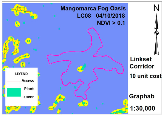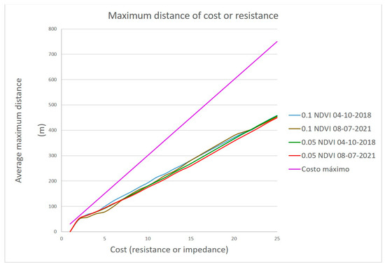The values of NDVI ≥ 0.05 correspond to the range from sparse or less intensive greenery to the highest intensity of greenery. If only the most intense greenery is considered, where the NDVI would correspond to values equal to or greater than 0.1, the cost or resistance would be 22 (399.9 m) for the image on 4 October 2021 and the cost 23 (equivalent to 419 m) for the image on 8 July 2021.