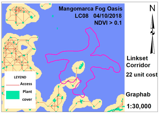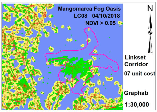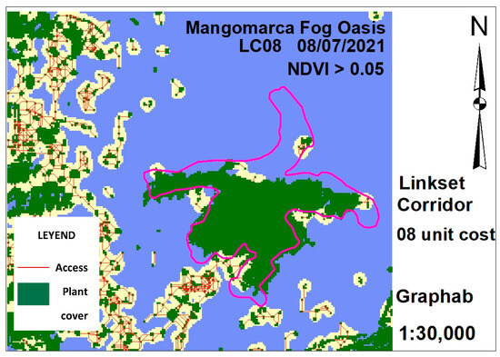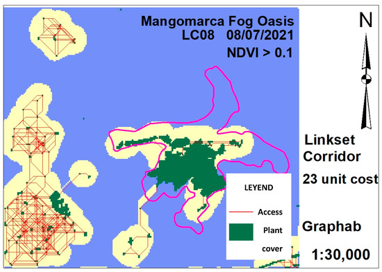The costs (resistance scale) and respective distances for the connectivity of the hill and green areas patches are evident. For the case of NDVI = 0.05 images, on 4 October 2021, a resistance must be overcome or a cost value of 7 must be assumed, equivalent to 126 m. Similarly, for NDVI ≥ 0.05 for the image on 8 July 2021, a cost of 8 is equivalent to 139 m.