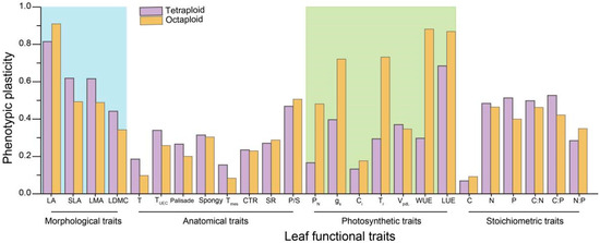 Furthermore, the phenotypic plasticity of leaf functional traits between these two cytotypes was further calculated and is illustrated in Figure 3. The morphological and photosynthetic traits showed great phenotypic plasticity compared to the anatomical and stoichiometric traits in the B. macrostachya complex. Among all of these functional traits, both LA and LUE showed great phenotypic plasticity (PI > 0.5) in these two cytotypes. The plasticity indices of LA in the tetraploid and octaploid plants were 0.81 and 0.91, respectively (Figure 3), and 0.68 and 0.87 for LUE, respectively. In the tetraploid B. macrostachya, the SLA, LMA, P concentration, C:N ratio, and C:P showed a high plasticity index, whereas P/S ratio, gs, Tr, and WUE had great plasticity in the octaploid plants (Figure 3). The other functional traits showed relatively low phenotypic plasticity (PI < 0.5) in both cytotypes.