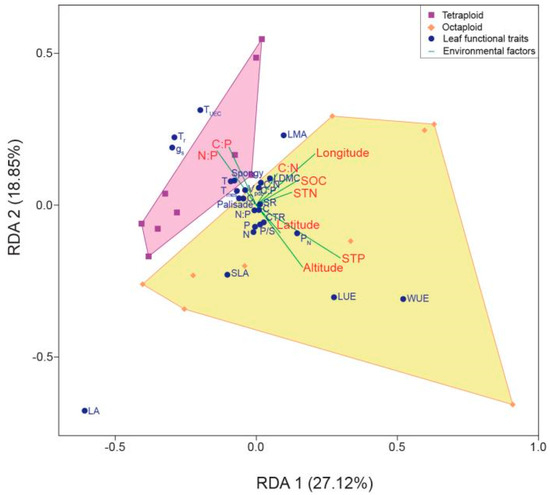 The relationships between leaf functional traits and environmental conditions were interpreted and displayed through the RDA. The RDA revealed that RDA 1 and RDA 2 totally explained 45.97% of the total variations. RDA 1 and RDA 2 separately accounted for 27.12% and 18.85% of the total variations (Figure 4). The results of the RDA biplot indicate that the populations of tetraploid and octaploid B. macrostachya were classified into two discrete clusters with no overlap. Moreover, the tetraploid cytotypes were characterized by larger TUEC, Tr, and gs, while the octaploid cytotypes were characterized by high WUE, LUE, SLA, and PN. In addition, the geographic distributions of octaploid B. macrostachya showed a high altitude, longitude, and STP concentration compared to the tetraploid ones, which had habitat soil stoichiometry with higher relative C:P and N:P ratios.