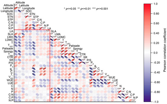 In addition, the relationships among leaf functional traits were also analyzed. In morphological traits, LMA was significantly positively with LDMC, whereas SLA exhibited a negative correlation with both LMA and LDMC. Moreover, leaf morphological traits were closely associated with leaf stoichiometric traits. SLA was positively correlated with leaf N and P concentrations, while it was negatively correlated with C:N and C:P ratios. LDMC was negatively correlated with N and P concentrations, but positively correlated with C:N and C:P ratios. In anatomical traits, there were significant positive correlations (p < 0.001) among T, TUEC, palisade, spongy, and Tmes. CTR was significantly negatively associated with T, TUEC, spongy, and Tmes. SR negatively correlated with palisade and CTR, but positively correlated with spongy. In physiological traits, WUE was significantly negatively correlated with anatomical traits, including T, TUEC, palisade, and Tmes. Tr was positively correlated with palisade. Similarly, the relationships among environmental factors were also analyzed. The soil C:N and C:P ratios positively correlated with SOC and STP, but negatively correlated with STP.