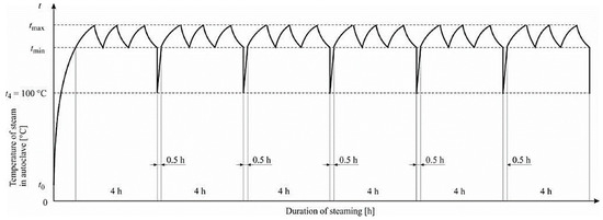 Test material in the form of blanks with dimensions of 32 × 50 × 800 mm were produced by longitudinal and transverse sawing from central lumber of thickness h = 32 mm with wood of false heartwood from Poľana (Slovakia). A total of 380 sapwood blanks and 380 false heartwood blanks were randomly selected. The blanks were divided into 19 groups so that each group contained 20 sapwood blanks and 20 false heartwood blanks. The cuttings of the first group in number were unsteamed. The other blanks were steamed with saturated moist air at a temperature of tI = 95 ± 3 °C, or with saturated steam in Mode II with a temperature of saturated water steam tII ≈ 105 ± 3 °C and Mode III with a temperature of saturated water steam tIII ≈ 120 ± 3 °C. Individual cages with steamed wood were removed from the steaming autoclave after steaming τ = 4 h, τ = 8 h, τ = 12 h, τ = 16 h, τ = 20 h and τ = 24 h. The steaming of the wood was carried out in a pressure autoclave APDZ 240 (Himmasch AD, Haskovo, Bulgaria) installed at Sundermann s.r.o. Banská Štiavnica (Slovakia). The steaming conditions of beech wood with a false heartwood with saturated water steam with marked time intervals of sampling during thermal treatment v are shown in the diagram in Figure 1.