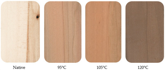 The light white–gray color of the sapwood beech wood and the brown–red color of the wood of the false heartwood will change over the course of 24 h steaming with saturated moist air at a temperature of tI = 95 ± 3 °C, changing to a pale brown color. The color of sapwood beech wood and wood with a false heartwood changes over 24 h of steaming with saturated steam at temperatures tII = 105 ± 3 °C and tIII = 120 ± 3 °C, changing to brown–gray color shades. The colors of beech wood before steaming and after steaming are shown in Figure 2.