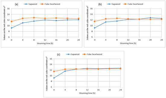 The changes in the red color coordinate a* during τ = 24 h of steaming of beech wood indicate certain differences in the color of the sapwood and the wood of the false heartwood. The sapwood, in the process of steaming at temperature tI ≈ 90 °C, recorded an increase in the values of the red color coordinate in the first τ = 12–16 h from the value a0* = 9.2 to the value a16* ≈ 12.1. During the steaming of beech sapwood at the steaming temperatures tII ≈ 105 °C and tIII ≈ 120 °C, the value of the red coordinate of the red color in the first hours of steaming increased by ∆a* ≈ 3.5, which was visually manifested by the reddening of the wood, and consequently, the value of the red color of the steamed wood did not change.