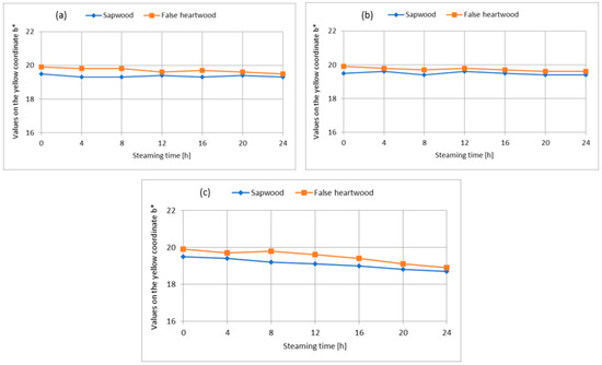 From the changes in the lightness coordinate L* and the chromatic coordinates of the red color a* and yellow color b* in Figure 3, Figure 4 and Figure 5, it follows that the uniform color of the steamed sapwood and wood of false heartwood is not the same, both from the aspect of the steaming time and the achievement of a uniform color. As the steaming temperature increases, the time required for color uniformity decreases. At the same time, the darkness of the brown or brown–gray color of the steamed beech wood, despite the shortened steaming time, increases.