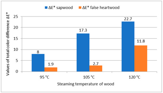 The unification of the colors by the steaming process is not evenly distributed in the individual modes between sapwood and heartwood. While the total color difference of sapwood to a color homogenized state is quantified by the value ∆E* = 8.0 at the steaming temperature of saturated moist air with a temperature of tI = 95 °C and at the steaming temperature of saturated water steam at the steaming temperature tIII = 120 °C by the value of ∆E* = 22.7, for wood with false heartwood at the steaming temperature tI = 95 °C, the total color difference is only ∆E* = 1.9, and at the steaming temperature tIII = 120 °C, ∆E* = 11.8.